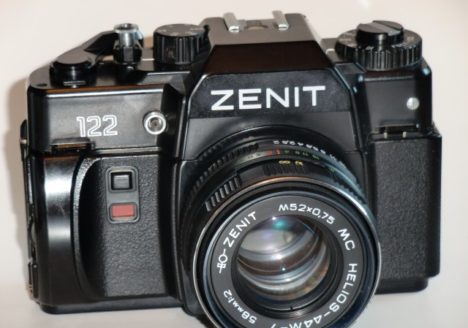 Name: Zenit 122 technische Daten: Hersteller: Krasnogorsk Mechanik-Werke (KMZ) UdSSR Gebaut: 1989-2005 Format: 135er Film 24X36 Objektiv: Helius-44M-7 1:2/58 M42 autom. Verschluss: 1/30 bis 1/500 B SRL Beschreibung: Schnittbildentfernungsmesser Innenlichtmessung über Leuchtdioden…