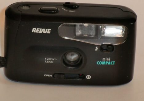 Name: REVUE mini Compact technische Daten: Hersteller: Revue Quelle, Fürth Gebaut: ? Objektiv: 1:9/28mm unvergütet 2 Linsen Format: 135er Film 24X36 Verschluss: feste Verschlusszeit 1:125 Beschreibung: Eingebautes Blitzlicht Panorama Umschaltung 13X36mm Objektivverschlussschieber…