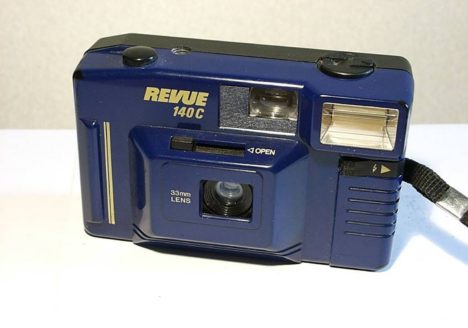 Name: REVUE 140 C technische Daten: Hersteller: Revue Quelle, Fürth Gebaut: 1989 Objektiv: 5,6/33 unvergütet Format: 135er Film 24X36 Verschluss: Programm 130 Beschreibung: Eingebautes Blitzlicht Objektivverschlussschieber Batterien AAA 2Stück Trageschlaufe