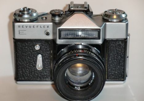 Name: Revue Flex E technische Daten: Hersteller: Unbekannt (Handelsmarke Quelle, Fürth vermutlich UdSSR) Gebaut: ca. 1965-1982 Format: 24X36 Objektiv: Wechseloptik M42 manuell Fokus Verschluss: 1/30 bis 1/500 Sek. B Beschreibung: Belichtungsmesser Gummituch Schlitzverschluss…