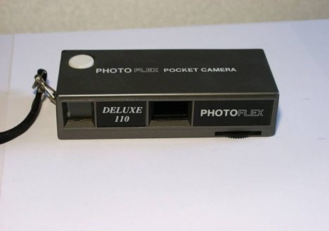 Name: PhotoFlex Deluxe 110 technische Daten: Hersteller: Photoflex Gebaut: bis 1980 Format: 13X17 Spezial Pocketfilm Objektiv: Meniskus Verschluss: einfach Beschreibung: Trageschlaufe
