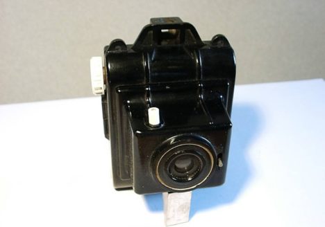 Name: Pionier Deko technische Daten: Hersteller: Kodak VEB, Berlin – Köpenick Gebaut: 1947 Objektiv: Meniskus 11 unvergütet Format: Rollfilm 4X4 Belichtungszeiten: M & B Beschreibung: Bakelitkamera Drahtauslöseranschluss