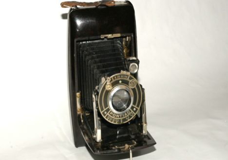Name: Pontiac technische Daten: Hersteller: Pontiac, Paris / Frankreich Gebaut: 1939 Format: 120er Rollfilm 6X9 Optik: Pontiak 4,5/105 unvergütet Verschluss: 1/25, 1/50, 1/100, B Beschreibung: Faltkamera aus Bakelit Brillantsucher Drahtauslöseranschluss Stativanschluss Trageriemen