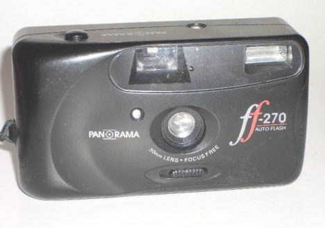 Name: Panorama ff-270 technische Daten: Hersteller: Handelsmarke von Ottoversand Hamburg Gebaut: ca.1998 Format: 24X36 Objektiv: 30/8 unvergütet frei Focus Verschluss: fest 1:250 Beschreibung: Motortransport Blitzlicht automatisch nicht abstellbar Batterien 2XAA Trageschlaufe