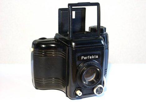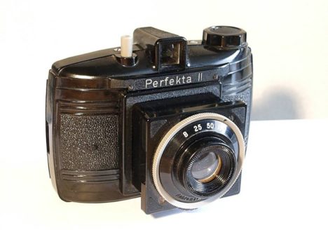 Name: Perfekta II technische Daten: Hersteller: VEB Rheinmetall Gebaut: 1956 Format: 120 Rollfilm 6X6 Objektiv: 7.7/80 unvergütet Belichtungszeiten: 1/25, 1/50, 1/100, B Beschreibung: Bakelitkamera Objektiv versenkbar Sucherkamera Drahtauslöseranschluss Stativanschluss