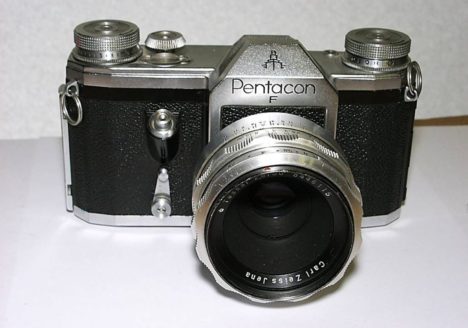 Name: Pentacon F technische Daten: Hersteller: VEB Carl Zeiss Jena Gebaut: 1956 bis 1961 Format: 135er Film 24X36 Schlitzverschluss: Gummituch 1 bis 1/1000 Optik: Wechseloptik M42 Beschreibung: Spiegelreflexkamera Automatikblende Blitzkontakt Filmmerkscheibe Selbstauslöser…