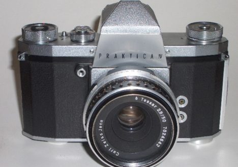 Name: Praktica IV technische Daten: Hersteller: VEB Pentacon Dresden Gebaut: 1959 bis 1960 Format: 24X36 Objektiv: Wechseloptik (Druckblende) Verschluss: 1/2 bis 1/500 B Beschreibung: Gummituch Spiegelreflexkamera Schnellspannhebel erste Praktica mit fest eingebauten Dachkantenprisma…