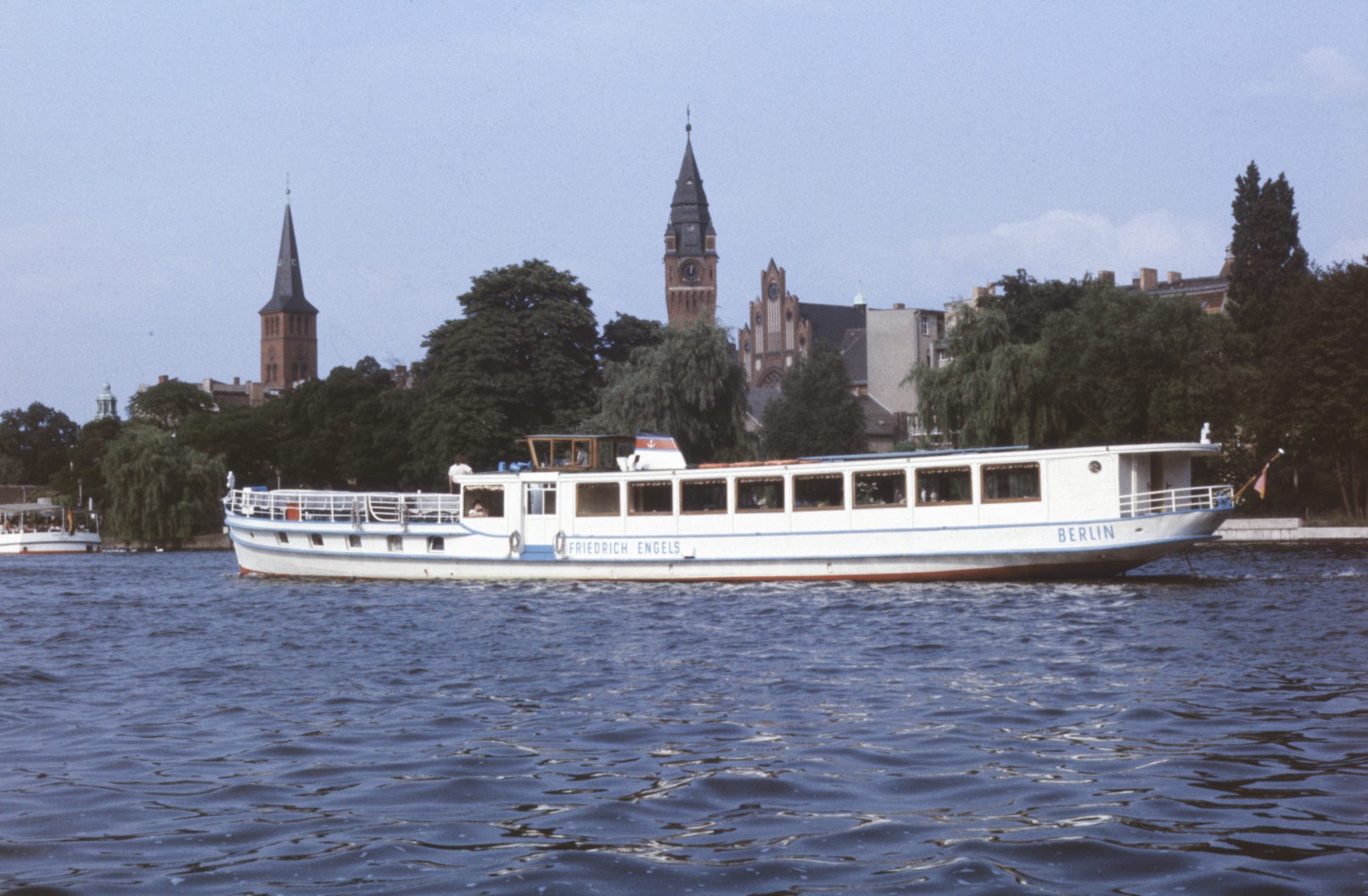 Ein Schiff der Weißen Flotte am Luisenhain in Köpenick. Im Hintergrund das Rathaus Köpenick und die Stadtkirche